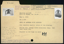 | Description: | Neck of amphora with one complete handle; piece of rim missing. Rolled rim, below which, red band. Dipinto in red high on neck: <graphic> Orange-brown micaceous clay. ADDENDA The handle completed and much of the upper wall added from sherds. The vase has now both handles, most of the shoulder and part of the body below the shoulder (2 August 1976). | |