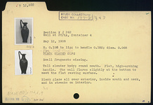 | Description: | Small fragments missing. Tall slender body; round mouth; flat high-arching handle; the wall flares slightly at the bottom to meet the flat resting surface. Black glaze all over exterior, inside mouth and neck and in streaks on interior. | |