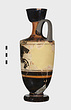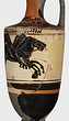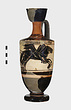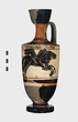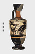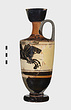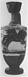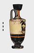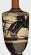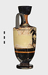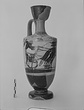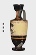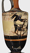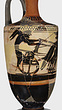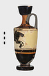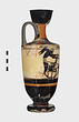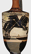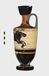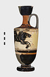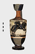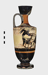 Description:   Mended from many fragments; restored in plaster. Missing part of lip, handle, fragments from shoulder and wall, and chips from base. Figured scene depicts winged quadriga with winged charioteer. From the scene, the missing pieces include the top of the charioteer's head, the middle of his body, the top of the chariot rail, a bit of the wheel, the tips of the horses' tails and of the upper wing.
