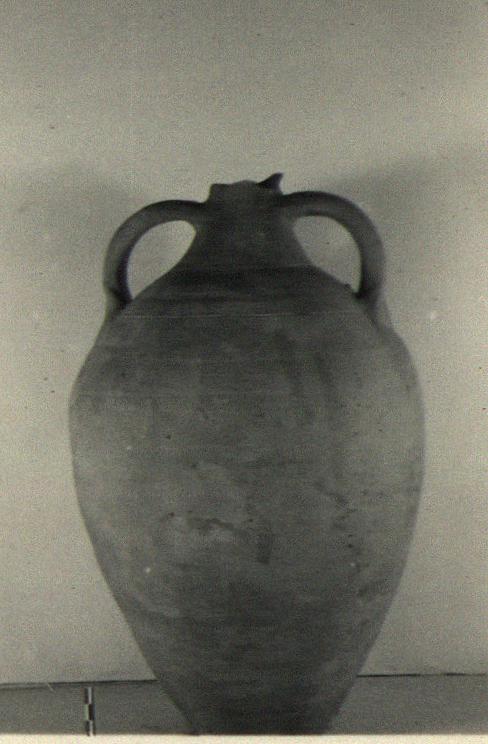 | Description: | Mouth missing, hole in shoulder; otherwise intact. Bottom concave, with knob at center; egg-shaped body, shoulder sloping to join tapering neck; single-grooved handles, from middle of neck to shoulder. Two grooves around shoulder at line of lower handle attachments. Dipinto on shoulder: <graphic> Light red clay. Smears of some brown substance on the outside. | |