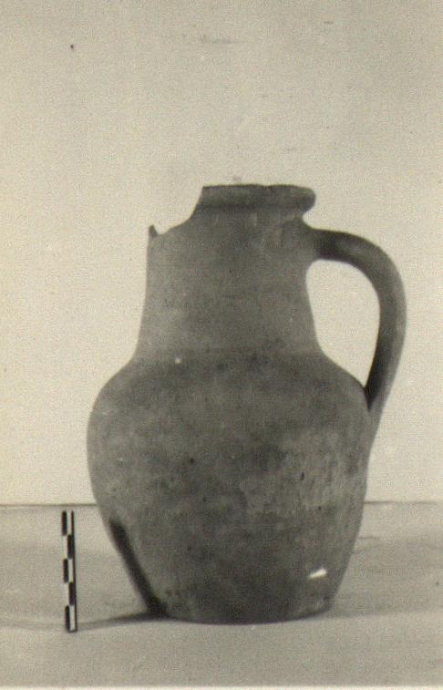 | Description: | Front part of lip missing. Flat bottom; short shoulder; wide slightly tapering neck, flaring lip; plain band handle from below lip to shoulder. Coarse red-buff clay. Light slip. High-necked, flat-bottomed jug. | |