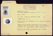 | Description: | Much of body and fragments of lip missing; restored in plaster. Plump round-bottomed cooking pot with sloping, slightly concave shoulder. Round mouth, flaring profiled lip. Band handle, lip to shoulder. Handmade of brown micaceous clay; slipped. Rim and shoulder wheelmade. | |
