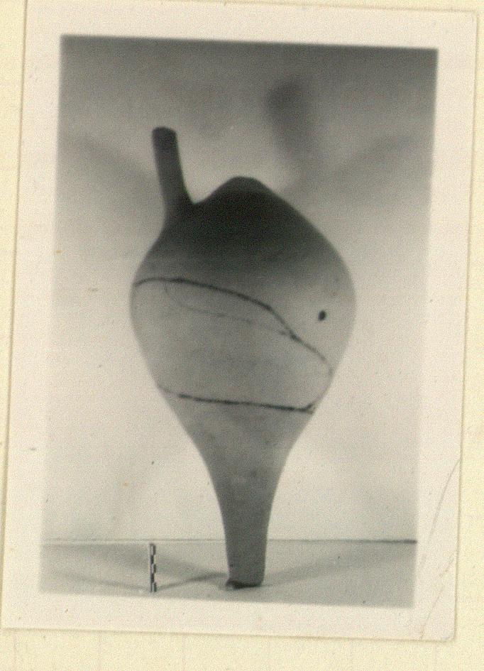 | Description: | Neck missing with one handle and most of the other, and fragments from wall. Inverted pear-shaped body tapering to long thick toe. Handle round in section, the line of each handle is continued by a vertical ridge on the wall below the attachment. Micaceous buff clay gray at core. | |