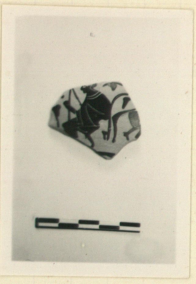 | Description: | From the wall of a cup-kotyle. Draped figure seated left on stool; to right, hind-quarters and tail of an animal. Ivy leaves in field. Trace of red on hair and for dots on garment(?). A little coarse incision. | |