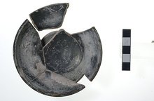 | Description: | Fragmens of rim and floor missing. Cup foot with rounded edge reserved. Short thick stem. Shallow open bowl with slightly thickened lip marked off outside by a scraped groove. Glaze slightly peeled. Cf. Agora XII, no. 966. | |