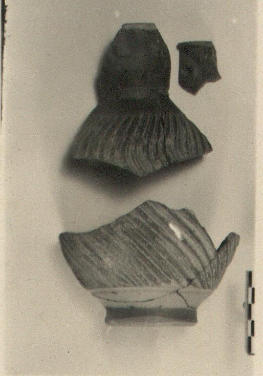 | Description: | Parts of neck, wall and foot preserved. Restored in plaster. Neat low foot ring. Squat body, high slightly flaring neck, rim broken away. Walls decorated with wide, deep swirled gouges. Gritty pink cay, dull glaze black to red. | |