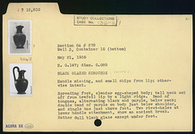 | Description: | Handle missing (restored) and small chips from lip; otherwise intact. Spreading foot, slender egg-shaped body; tall neck set off from trefoil lip by a light ridge. Band of tongues, alternating black and purple, below neck; double band of purple on body just below shoulder, and single one just above foot. Two rivet holes at lower handle attachment, show an ancient break. Rather dull black glaze except under foot. | |