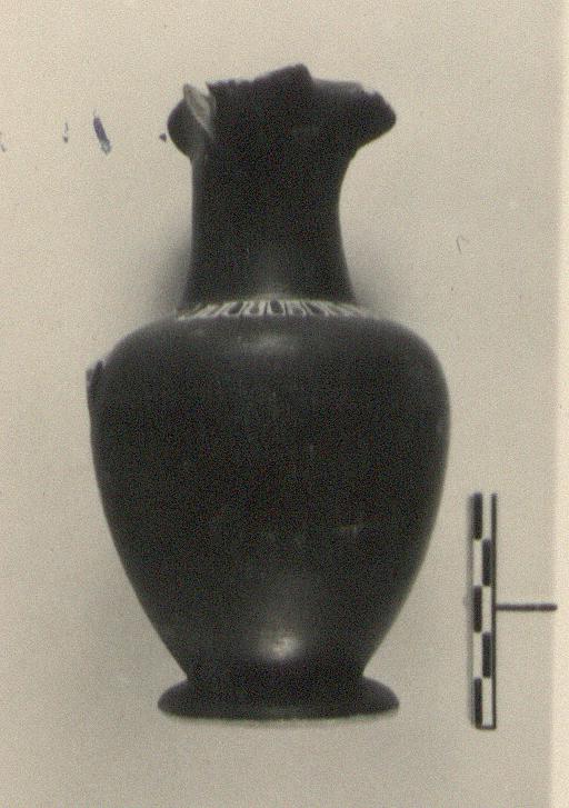 | Description: | Handle missing (restored) and small chips from lip; otherwise intact. Spreading foot, slender egg-shaped body; tall neck set off from trefoil lip by a light ridge. Band of tongues, alternating black and purple, below neck; double band of purple on body just below shoulder, and single one just above foot. Two rivet holes at lower handle attachment, show an ancient break. Rather dull black glaze except under foot. | |