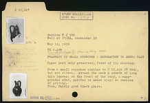 | Description: | Front of lip and parts of body missing; restored in plaster. From a small oinochoe similar to P 12816 (Ψ 294), but not ribbed. Around the neck, a wreath of long thin leaves; on the front of the body, a many-pointed star, painted in added clay. No remains of gilding. Firm, fairly good black glaze. | |