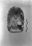 | Description: | Bottom and vase mouth missing; otherwise intact, save for chips and one bunch of grapes. A short badly proportioned nude figure stands in a cave, from the scalloped edge of which hang bunches of grapes. He holds a large flower-like object (patera?) in his left hand, and some object in his right. His hair hangs in curls to his shoulders, and he wears a cap or heavy doubled fillet. Abundant traces of added white. | |