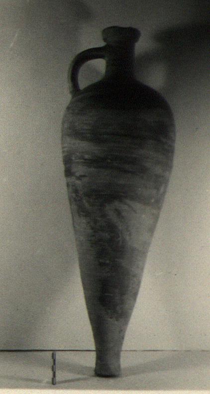 | Description: | Hole in shoulder; minor fractures. Body tapers to pointed bottom; narrow neck, flaring lip; ridged handle. A black dipinto (palimpsest?): <graphic> Streaks of glaze on shoulder. ADDENDA Sparta series [JWH]. | |