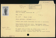 | Description: | Intact save minor fractures and hole in shoulder. High flaring foot; egg-shaped body; very narrow mouth and neck; short rolled handles, from middle of neck to shoulder. On upper part of body, on either side, a pair of spirals in added color (now purplish). Coarse red clay; lighter slip; red and much flaked. ADDENDA Egyptian fabric [JWH]. | |