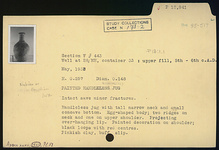 | Description: | Intact, save minor fractures. Small concave bottom; egg-shaped body; tall narrow neck; projecting overhanging lip; no handle. Two ridges on neck and one on upper shoulder. Painted decoration on shoulder: black loops with red centers. Pinkish clay. Buff slip. ADDENDA Nubian or Egyptian [JWH]. | |