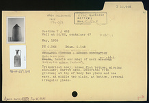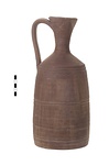 | Description: | [Originally mouth, handle and most of neck missing; now added.] Half of rim missing; restored in plaster. Broad flat bottom; cylindrical body; sloping shoulder; narrow neck. Decorated with grooves: at top of body, two plain and a wavy, at middle two plain, at bottom several irregular plain. | |
