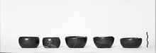 Pinkish-buff clay. Black glaze except for reserved bottom, with two circles and dot.