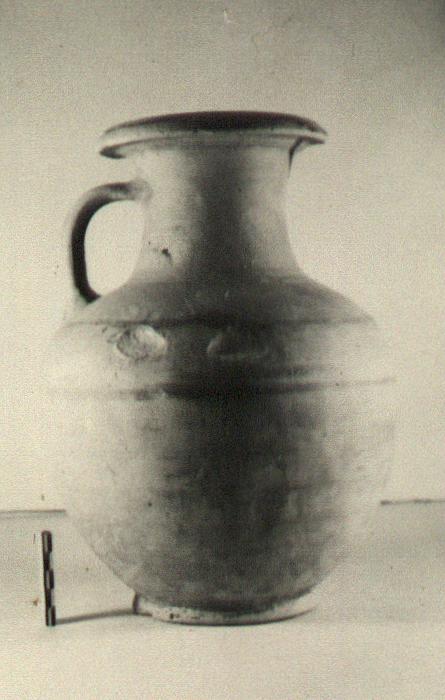 | Description: | Part of lip and both horizontal handles missing. Plump body with rounded shoulder; base ring; tall neck, vertical handle from well below rim to shoulder, flaring rim with downturned edge. Buff clay. On outside, thin reddish glaze wash; red to black glaze inside, on rim, for two bands on shoulder and on foot and wall just above. | |
