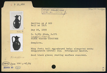 | Description: | Complete. Ring foot; tall egg-shaped body; elongated neck; exaggerated trefoil lip. Triangular handle. Good black glaze; resting surface reserved. | |