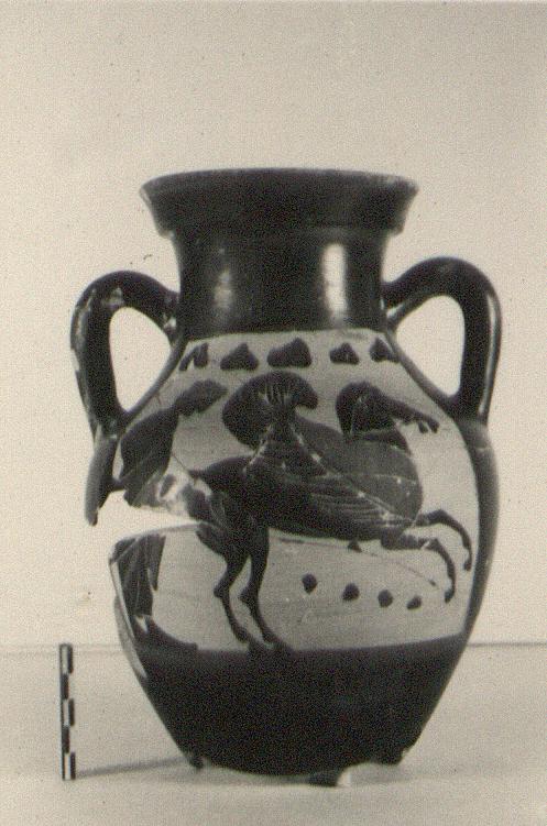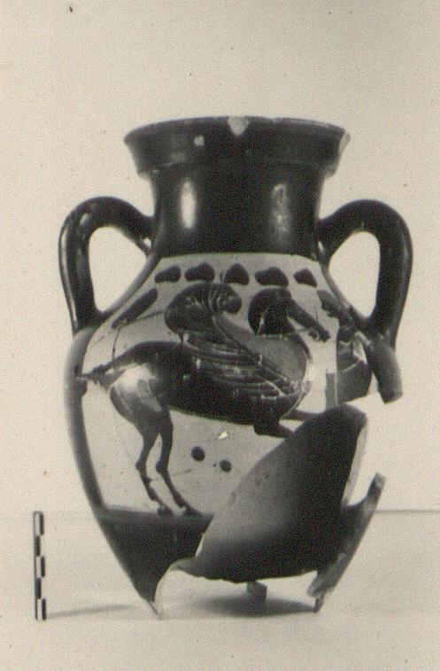 Description:   Base missing (restored in plaster) and a large piece of the side. Eggy body; neck and shoulder form continuous concave curve; offset flaring lip. Rising rolled handles, lower neck to shoulder. Above foot, rays, topped by a broad red band; then a red band at lower line of figured panels. Lip reserved on top, with red band at inner and outer edges. In panel, either side, a winged horse, prancing right; behind him, a cloaked standing man. Above, five ivy leaves; below the horse, four dots. Red for front part of horse's wing; for a band on his haunch; for the man's hair, and for stripes on his garment. Trace of white on horse's mane. Rather careless incision.