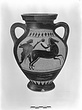 | Description: | One handle and nearly one-quarter of lip missing and chips; otherwise intact. Echinus foot; flaring lip, flat on top, offset from neck; eggy body with well marked shoulder; shoulder and neck form continuous concave curve; small rising rolled handles, lower neck to shoulder. Short rays above foot; two red bands around foot; one above rays, two below figured panel and two above, and one around neck. Top of lip reserved. A) Brown ground line; dotted linked buds between bands, above. Youthful horseman riding right on a black horse, a white horse just visible along side. Behind him a runner, right, a short cloak decorated with two rosettes over his left arm. Left hand outstretched. White for the rider's sleeved short tunic, and for the dots of the rosettes, as well as for the far horse. Red for the horse's mane and a stripe on haunch and belly; for the runner's hair and the centers of the rosettes on his cloak. Tail of one horse red, of the other white. B) Similar to A, but the runner is nearer the rider, and grasps his hair with the left hand. The runner's cloak has a broad red band and two dots and boy's hair is red. No dots in the band of buds. The runner's lower right foot and leg extend outside the panel, and are outlined by incision in the black of the wall. Glaze rather dull and worn; incision coarse. | |