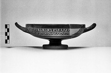 | Description: | Mended from eight pieces. Base and one handle complete; portions of bowl missing. Handle zone decorated with palmettes. Below handle zone a narrow reserved band. Reserved otherwise: outside and narrow resting surface of foot and center underside within foot; narrow band just inside rim and center with circle and dot. Moulded ring around short stem. | |