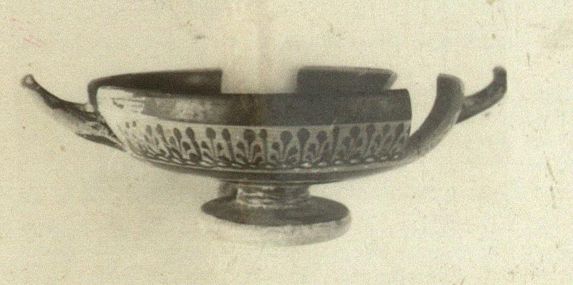 | Description: | Mended from eight pieces. Base and one handle complete; portions of bowl missing. Handle zone decorated with palmettes. Below handle zone a narrow reserved band. Reserved otherwise: outside and narrow resting surface of foot and center underside within foot; narrow band just inside rim and center with circle and dot. Moulded ring around short stem. | |