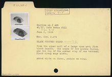 | Description: | From the upper wall of a large open pot. Depicts the heads of two sirens facing, and the top of the spread wing of one between. Black along edge above. Added white on faces, purple on wing. Firm black glaze inside. | |