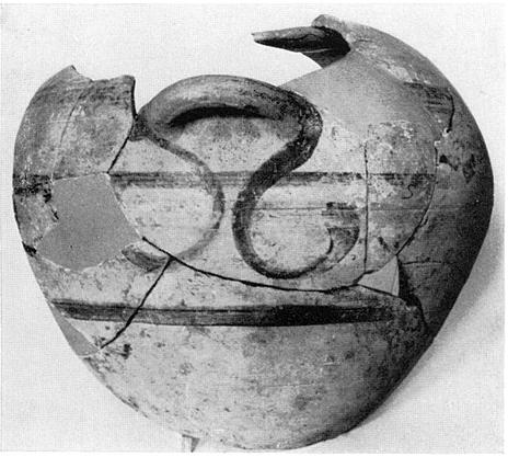 | Description: | Preserves a large part of the body, from above the foot to the base of the neck, including one of the horizontal handles. Nearly flat shoulder. The body banded at wide intervals; scrolls pendent from the handle attachments. Pinkish buff clay, brownish glaze, somewhat worn, for bands and on handle. | |