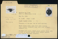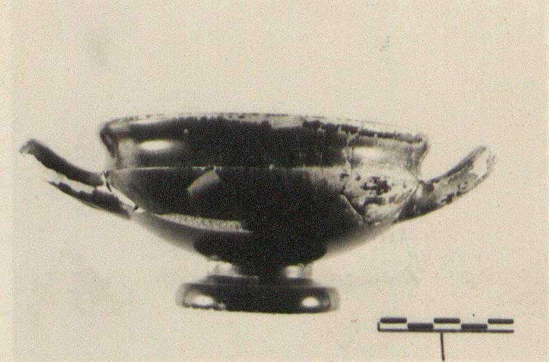 | Description: | Fragment of lip and one of wall missing. Short thick stem; high foot with rounded edge conical beneath; deep bowl with offset concave lip. Pinkish-buff clay; black glaze party fired red; a band of purple around stem; handle spaces and resting surface reserved. | |