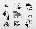 | Description: | Fragment from the rim and upper wall. The preserved part of the wall is almost vertical with a plain, slightly thickened, lip. A band of men to left, separated from one another by schematic trees; circles, zigzags and diamonds in the field. Above them a simple cable pattern between lines. Outline technique; cable pattern filled with white paint(?) and dotted; incision for garments. Black glaze band around upper wall inside. The glaze has almost entirely flaked away. | |