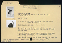 | Description: | The handle, much of the neck and lip, and part of the shoulder and wall preserved; nothing of lower wall or base. Restored in plaster. Rounded shoulder, round nearly straight neck with flat-topped projecting lip. High swung double handle, lip to shoulder. Black glaze outside and on neck inside; lip reserved and handle. Two purple bands below lower handle attachment, and narrow lines at edges of lip. | |
