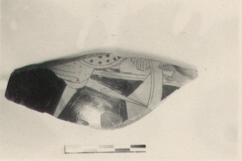 | Description: | Wall fragment from bell krater. Part of the wheel and floor of a chariot to the right, with the feet and the bottom of the drapery of the occupant. Part of a shield(?) in the chariot, and of a wing(?) at the hub of the wheel. Relief contour. Shiny black inside. | |