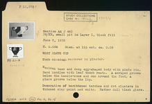 | Description: | Much missing; restored in plaster. Moulded base and deep egg-shaped body with plain rim. Band handles with leaf thumb-rests. A scraped groove below the handle zone and one around the foot; a plain groove below the lip. Decoration of beribboned torches and dot clusters in thinned clay-paint and white. Rather dull black glaze. | |