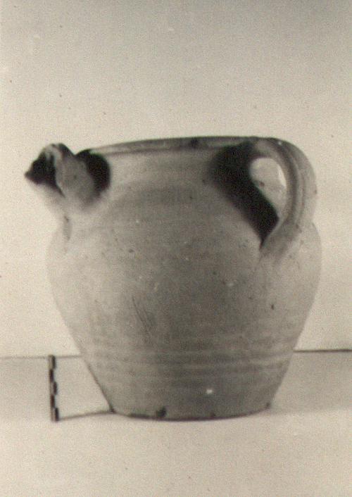 | Description: | One handle and end of spout missing. Flat bottom, out-turned rim, to which are attached the two vertical handles; large tubular spout just below rim and rising above it. Shallow wheel grooves on lower part of body. Wavy incised lines just below rim. Red-brown clay with white bits. Buff slip. Cf. P 13435. | |