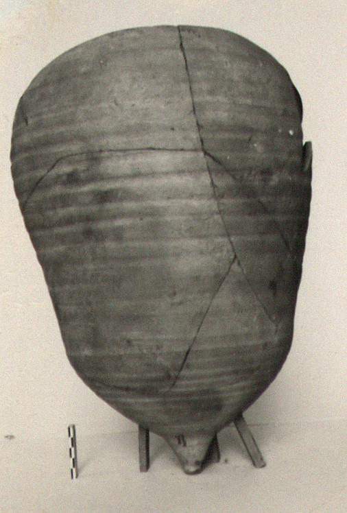 ADDENDA Made up into [nearly] whole pot. P.H. 0.42; Diam. 0.275. Fragments of wall and shoulder, whole of neck, mouth and handles missing. Ovoid body; pointed toe. Shallow wheel grooves. Heavy fabric.