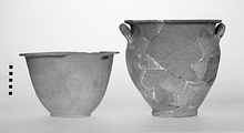 | Description: | Fragments of rim missing. Low ring foot; steep wall; projecting rim flat on top with a single groove around its inner edge. No handles. Yellow-buff clay; unglazed. | |