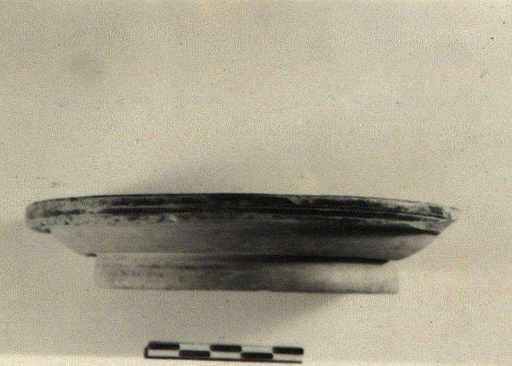 | Description: | Single fragment preserves rather more than half; rough hole bored through center. Ring foot; flat floor; broad outcurving rim moulded below and grooved around outer edge. Very heavy fabric. Unglazed. Somewhat blackened on top. | |