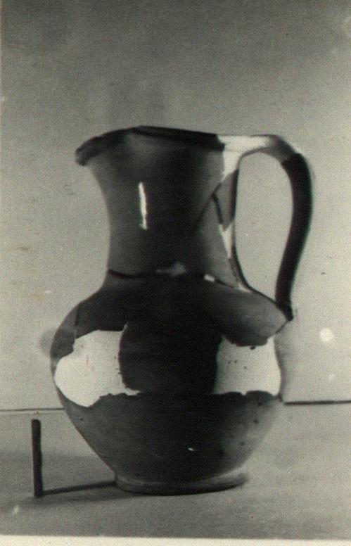 | Description: | Fragments of mouth, handle and body missing; restored in plaster. Ring foot; roundish body, squat and small in proportion to the neck; rather wide straight neck; trefoil mouth with grooves around vertical face. Pinkish-buff clay. Light buff slip. Traces of mastic on interior. Cf. Agora XXXIII, no. 6. | |