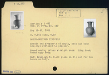 | Description: | Handle and fragments of mouth, neck and body missing; restored in plaster. Ring foot; broad eggy body; rather straight neck; round mouth. Dull brownish to black glaze on lip and for two bands on body. | |