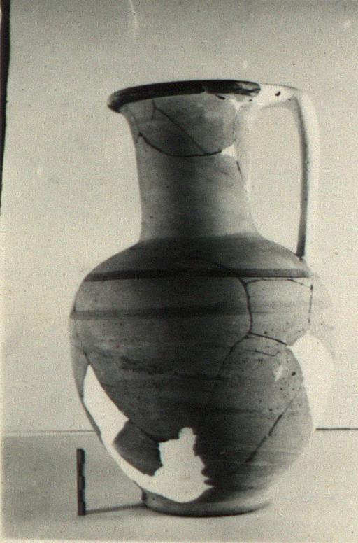 | Description: | Handle and fragments of mouth, neck and body missing; restored in plaster. Ring foot; broad eggy body; rather straight neck; round mouth. Dull brownish to black glaze on lip and for two bands on body. | |