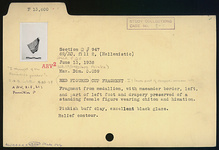 | Description: | Fragment from medallion. Preserved are: part of maeander border, left, and part of left foot and drapery of a standing female figure wearing chiton and himation. Pinkish-buff clay. Excellent black glaze. Relief contour. | |