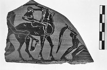 Description:   Fragment from the neck of a large krater, preserving part of a Dionysiac revel. In the middle a naked rider on an ithyphallic mule, right. On either side, a satyr and a maenad struggling. Red for the rider's fillet, the satyr's beard and the mule's mane. A white stripe on the mule's chest and haunch and around the basket which hangs from his penis. Coarse incision.