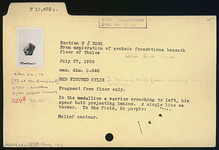 | Description: | Fragment from floor only. In the medallion, a warrior crouching to left, his spear butt projecting behind. A single line as border. In the field in purple: <graphic> Relief contour. | |