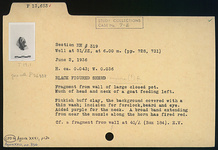 | Description: | Fragment from wall of a large closed pot. Much of head and neck of a goat feeding remains. Incision for forelock, beard and eye. Added purple for the neck. A broad band extending from near the muzzle along the horn has fired red. Pinkish-buff clay, the background covered with a thin wash. Cf. a fragment from wall at 40/Λ (box 184) [EV]. ADDENDA Goes with P 26438. | |