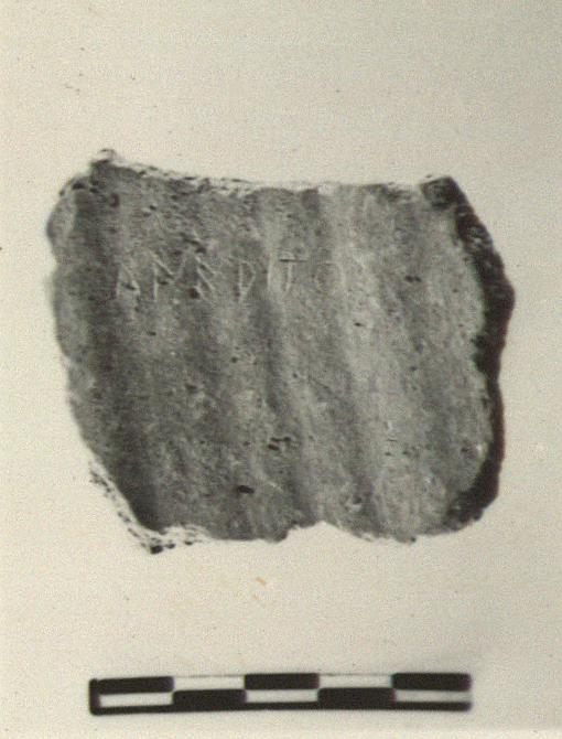 | Description: | Fragment of cooking ware hydria, preserving the stub of one of the horizontal rolled handles. Incised on the inside, lengthwise of the pot: <graphic> | |
