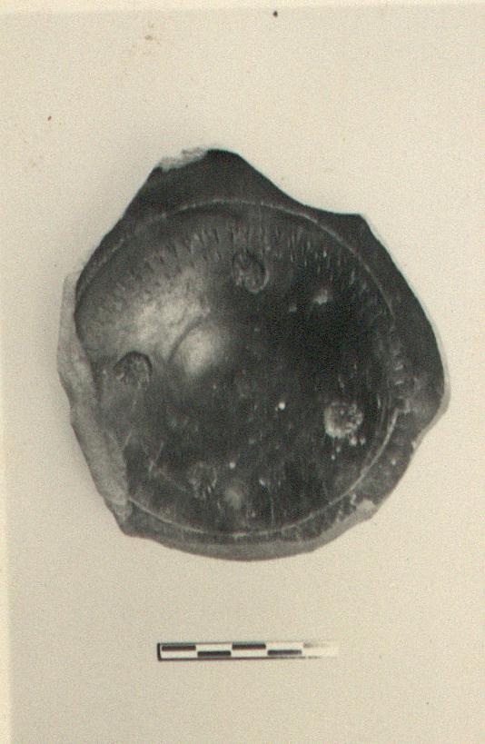 | Description: | A single fragment preserves the high ring foot and the center of the floor. Within a rouletted circle, four scattered palmettes. Stacking marks prominent. Dull black glaze over all, except for scraped groove at junction of foot and floor and resting surface of foot, reserved. | |