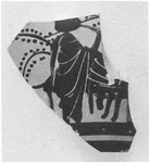 Description:   Figured scene depicts flute player at foot of couch. Upper part of flute player's blobby head missing. Behind him are preserved the drawn-up knees of the figure reclining on the couch. Sparing hasty incision for interior details; no accessory color.