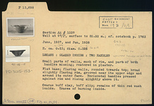 | Description: | Small parts of walls, much of rim, and parts of both handles missing; restored in plaster. Flat base; flaring walls, rounded toward top; broad slightly flaring rim, grooved near its upper edge and around its outer face. Horizontal handles pressed against rim and rising slightly above it. Coarse buff clay, buff slip; remains of thin red wash inside. Traces of burning inside. | |
