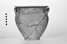 | Description: | Part of rim and wall with one handle missing; restored in plaster. Deep eggy body on ring foot; wide mouth with short straight neck and flat projecting rim. Horizontal handles on shoulder, up-tilted. Decoration in dull red wash around neck; a wavy line between two horizontal bands. Coarse buff clay; light buff slip. Ca. 7.5YR 7/4. | |