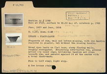| Description: | Fragments of rim, wall and bottom missing, with one handle; restored in plaster, but without the missing handle. Broad open basin on flat base; steep flaring walls, roughly corrugated. Projecting down-curved rim, grooved around its inner edge; horizontal handles set close beneath rim, and smeared against it at the center with a broad thumb-mark. Pink to buff clay; light slip. A few bronze stains. | |