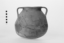 | Description: | Fragments of rim and walls missing; restored in plaster. Broad irregularly pear-shaped body with broad rounded bottom. Short straight neck, thickened lip. Two vertical band handles, neck to shoulder. Red cooking ware fabric with light bits, somewhat blackened. | |